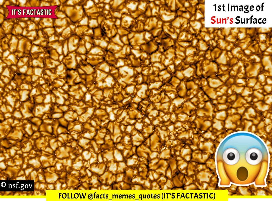 This is what SUN’S Surface looks like! January 30, 2020Posted in FACTSTagged corona sun, first image of sun's surface, high resolution image of sun surface, it's factastic, largest telescope in the world, sun surface first image, sun surface image, sun surface in greater detail, surface of sun, surface of the sun image, worlds largest telescope Instagram Post By :- @facts_memes_quotes (IT’S FACTASTIC) The World’s Largest Solar Telescope “Daniel K. Inouye” has captured it’s first highest resolution image of the surface of the sun! SHARING IS CARING! Share on Facebook (Opens in new window) Facebook Share on WhatsApp (Opens in new window) WhatsApp Share on X (Opens in new window) X Share on Telegram (Opens in new window) Telegram Email a link to a friend (Opens in new window) Email More Share on Tumblr (Opens in new window) Tumblr Share on Pinterest (Opens in new window) Pinterest Like Loading... Related